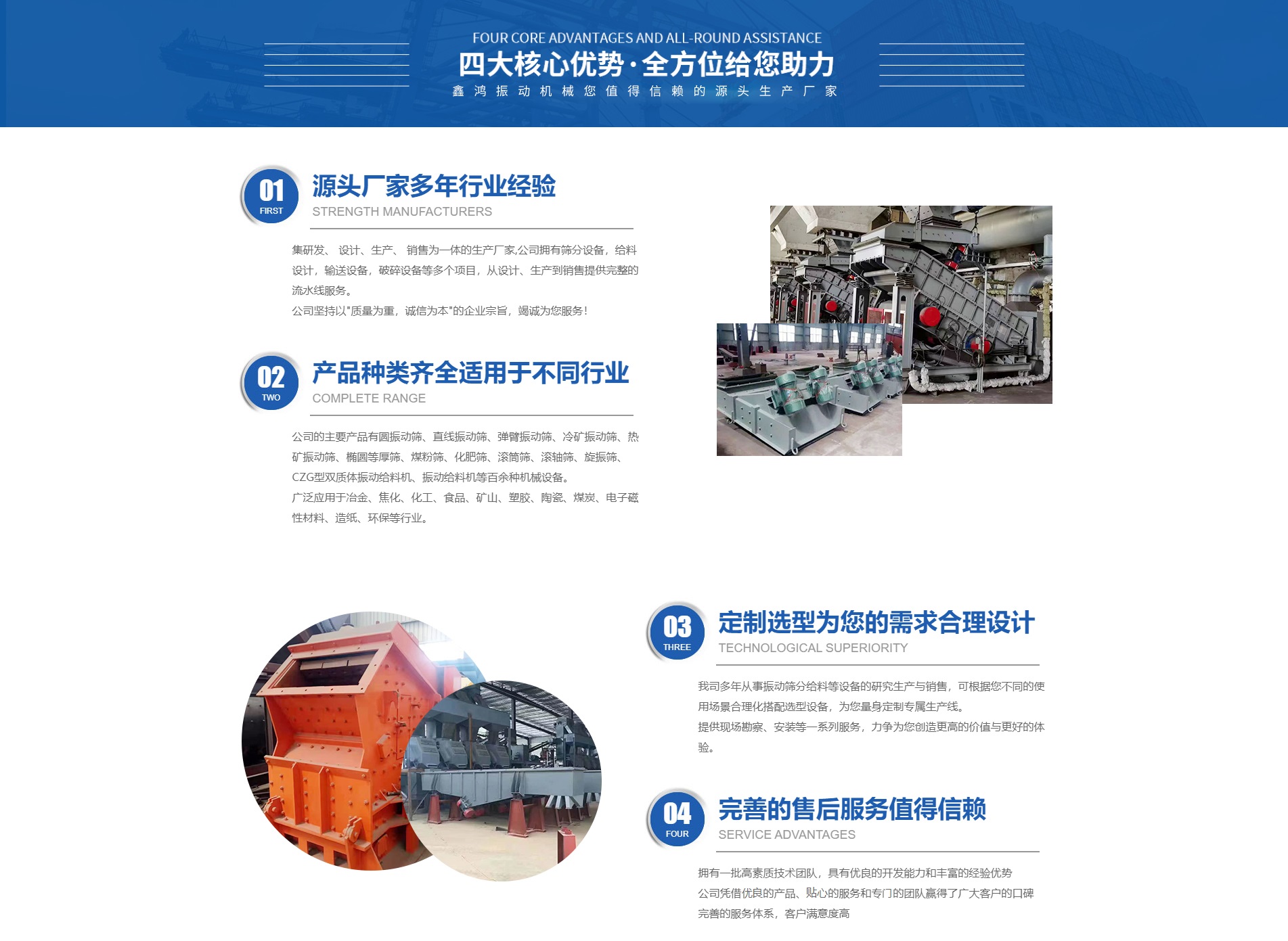 是從事振動(dòng)機(jī)械、礦山設(shè)備、輸送設(shè)備和生產(chǎn)制造的企業(yè),生產(chǎn)設(shè)備優(yōu)良、技術(shù)力量雄厚、檢驗(yàn)、檢測設(shè)備齊全,售后服務(wù)體系完善。